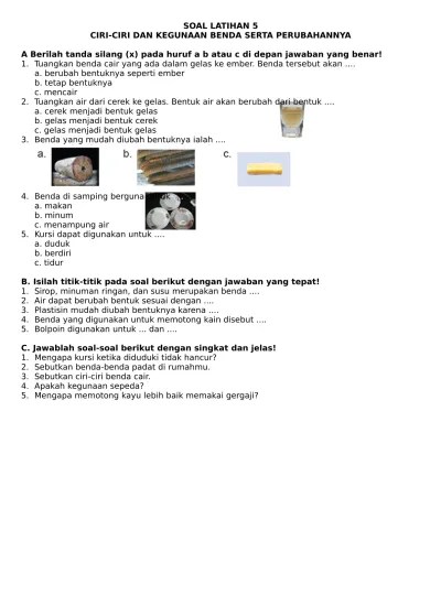Bapak/ibu/para siswa yang kami banggakan, anda masih bersama kami di soal.website | situs latihan soal untuk . Contoh benda padat adalah batu, besi, kertas, logam dan kayu. Dalam gelas yang berisi air, maka bentuknya akan tetap seperti telur. Misalnya seperti kertas yang bisa disobek, kayu bisa dipotong, . Pada perubahan wujud, biasanya benda padat bisa kembali menjadi wujud semula.